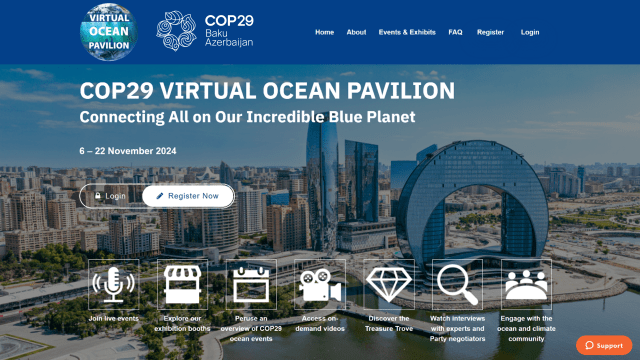 The Virtual Ocean Pavilion was launched during the UNFCCC COP26 (held in Glasgow, 31 October – 12 November 2021). A second was organized during COP27 (held in Sharm El Sheik, 6 – 18 November 2022), a third was organized at COP28 (held in Dubai, 30 November – 12 December 2023), and a fourth was organized at COP29 (held in Baku, Azerbaijan 11 – 22 November 2024).