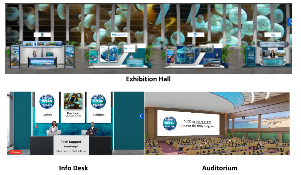 The 26 exhibition booths, a main attraction of the Pavilion which garnered over 5,000 total visits, were used by collaborating partners and sponsors to showcase their activities and resources on ocean and climate action. The booths provided access to information that attendees were able ‘take away’ in their virtual delegate bags as well as venues for informal meetings with experts and networking among exhibit hosts and attendees.