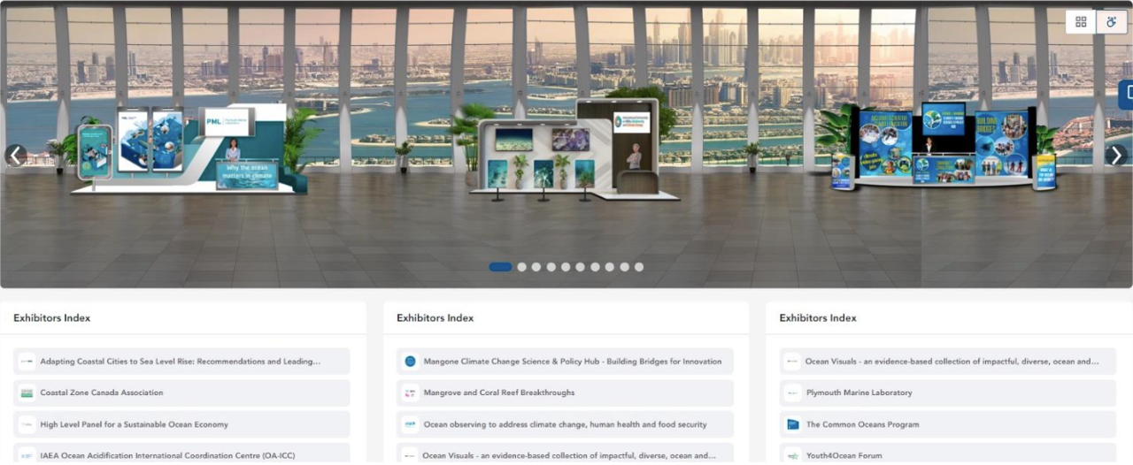 The Virtual Ocean Pavilion was launched during the UNFCCC COP26 (held in Glasgow, 31 October – 12 November 2021). A second was organized during COP27 (held in Sharm El Sheik, 6 – 18 November 2022), and a third was organized at COP28 (held in Dubai, 30 November – 12 December 2023).